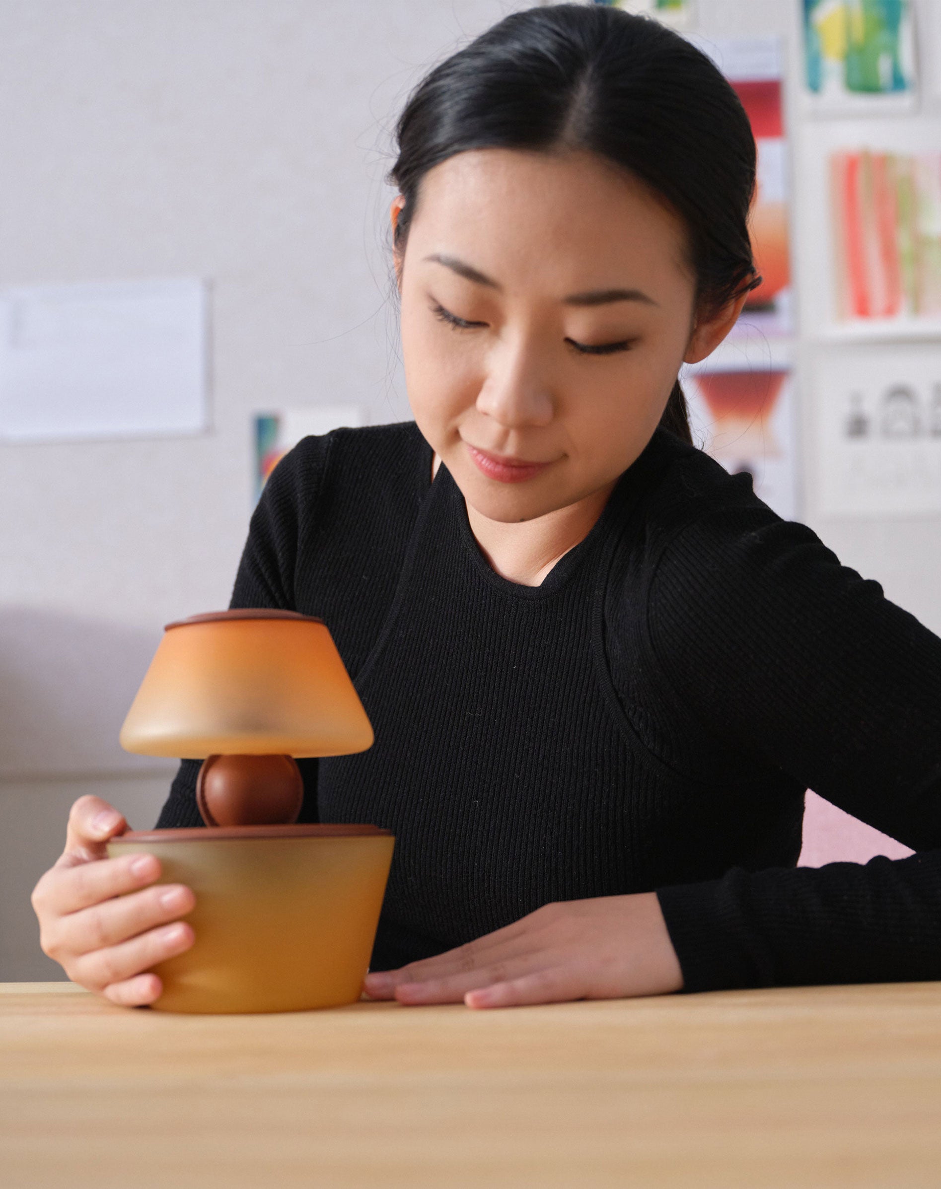 Passionnée par les expériences autour du verre, Jinya Zhao a abordé les chutes de cuir avec la même curiosité, se laissant guider par cette matière inédite dans sa recherche créative. L’artiste a développé un moule sur-mesure permettant de réaliser les modules en verre soufflé. Les pigments et le polissage au grain de diamant leur confèrent un aspect glacé et coloré. La sphère centrale, les plateaux arrondis et les dômes en bois sont gainés de chutes de cuir par les artisans maroquiniers de Polène. La couture des contours et la peinture sur tranche requièrent tout leur savoir-faire minutieux.