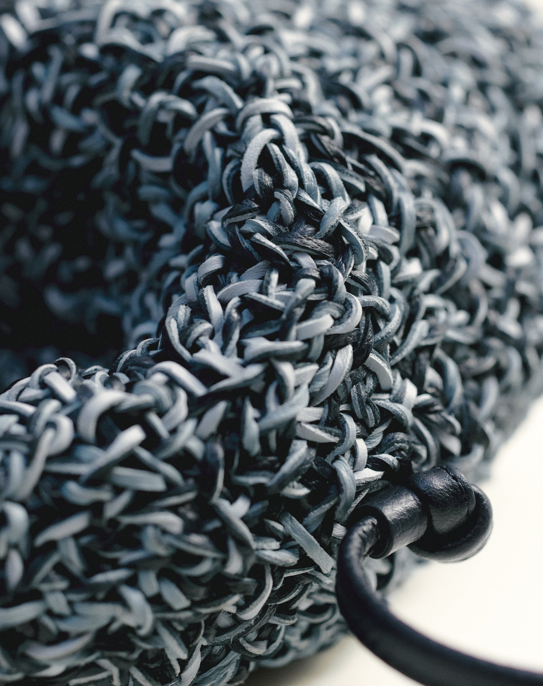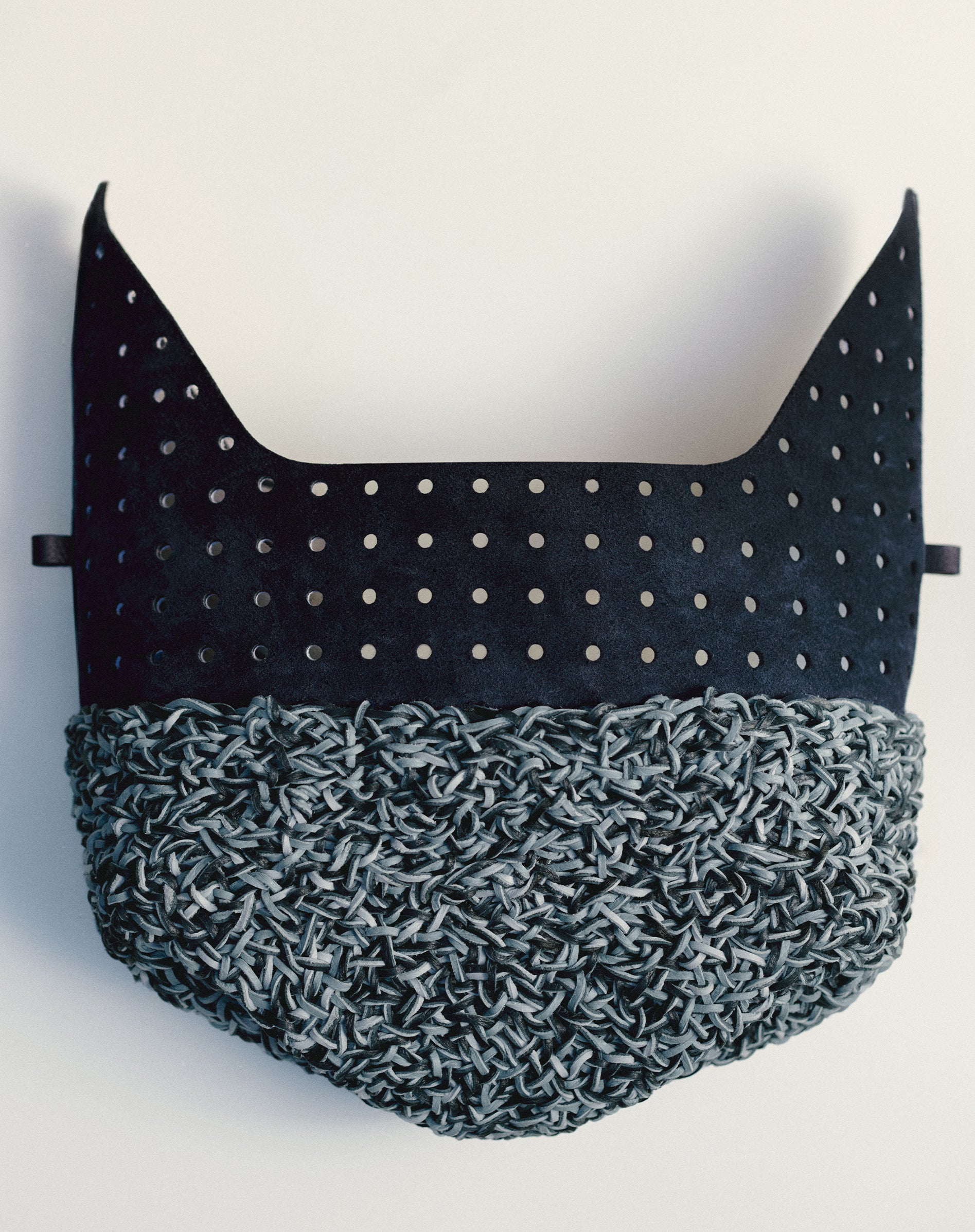 Sa silhouette emblématique, dessinée à partir de quatre pans de cuir, se pare d’un cuir entrelacé à la main, où chaque cordon et chaque point aléatoire affirme l’unicité de la pièce. Les artisans, véritables explorateurs du geste, composent motifs et alliances de cuirs : chaque nouage, patient et précis, peut demander jusqu’à cinq jours pour atteindre un équilibre parfait.