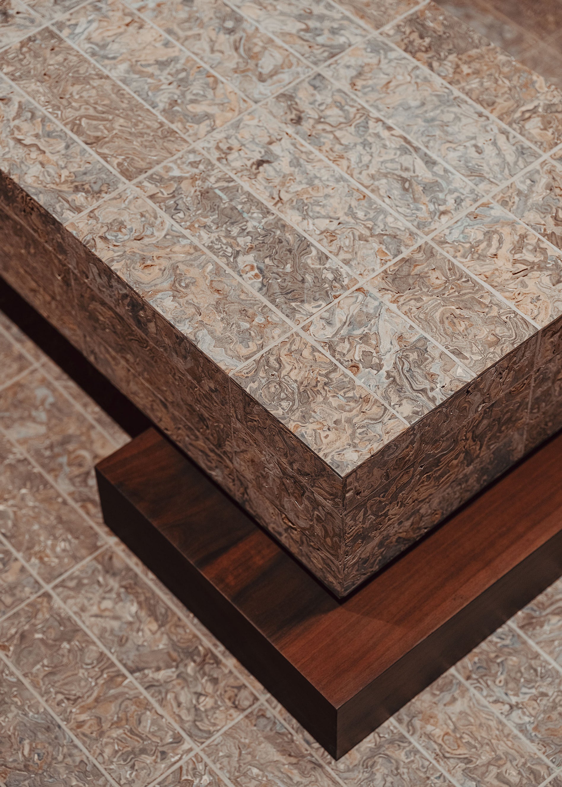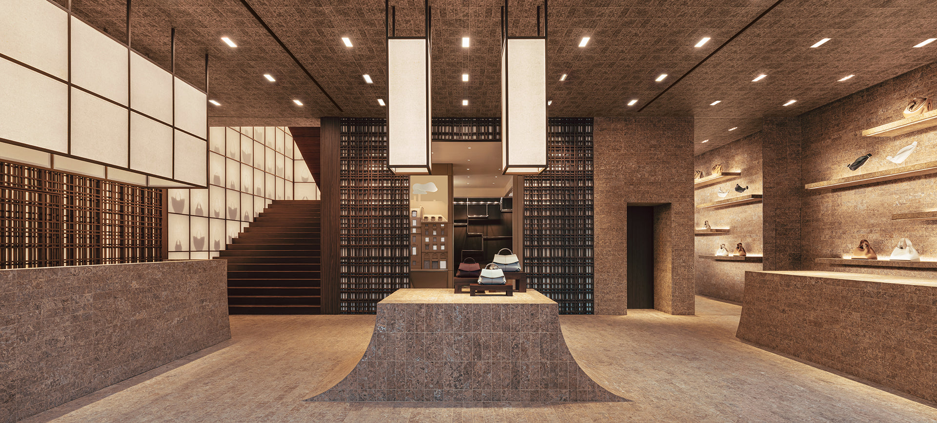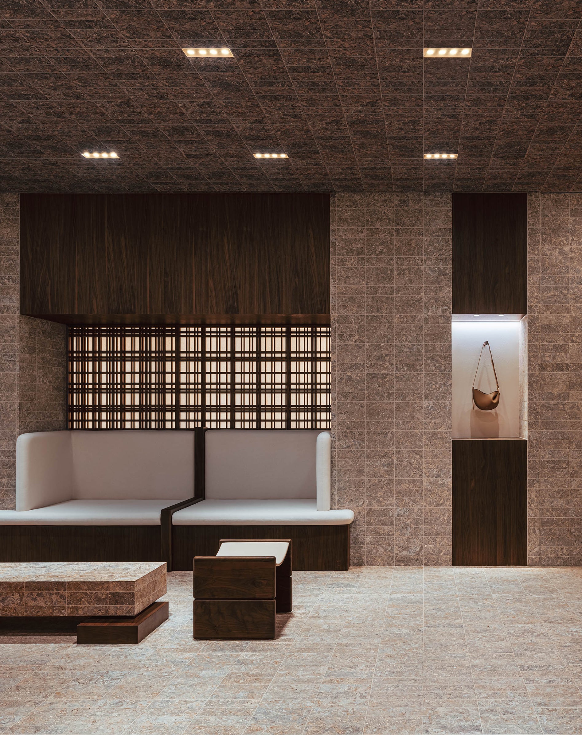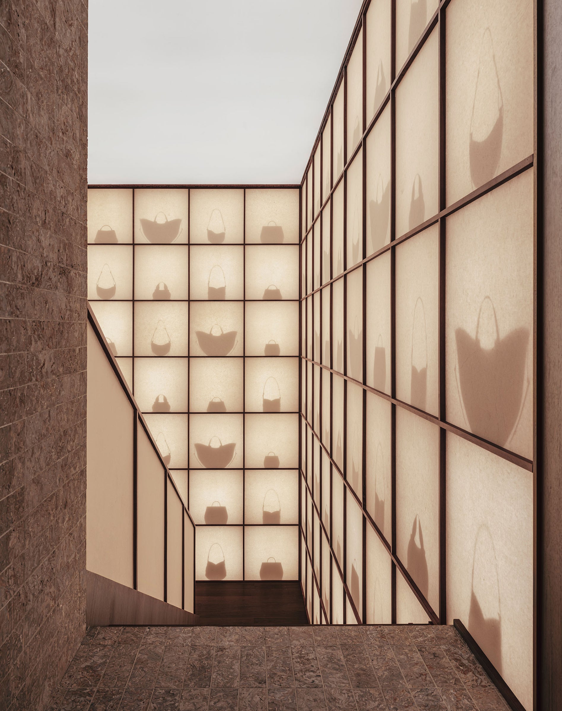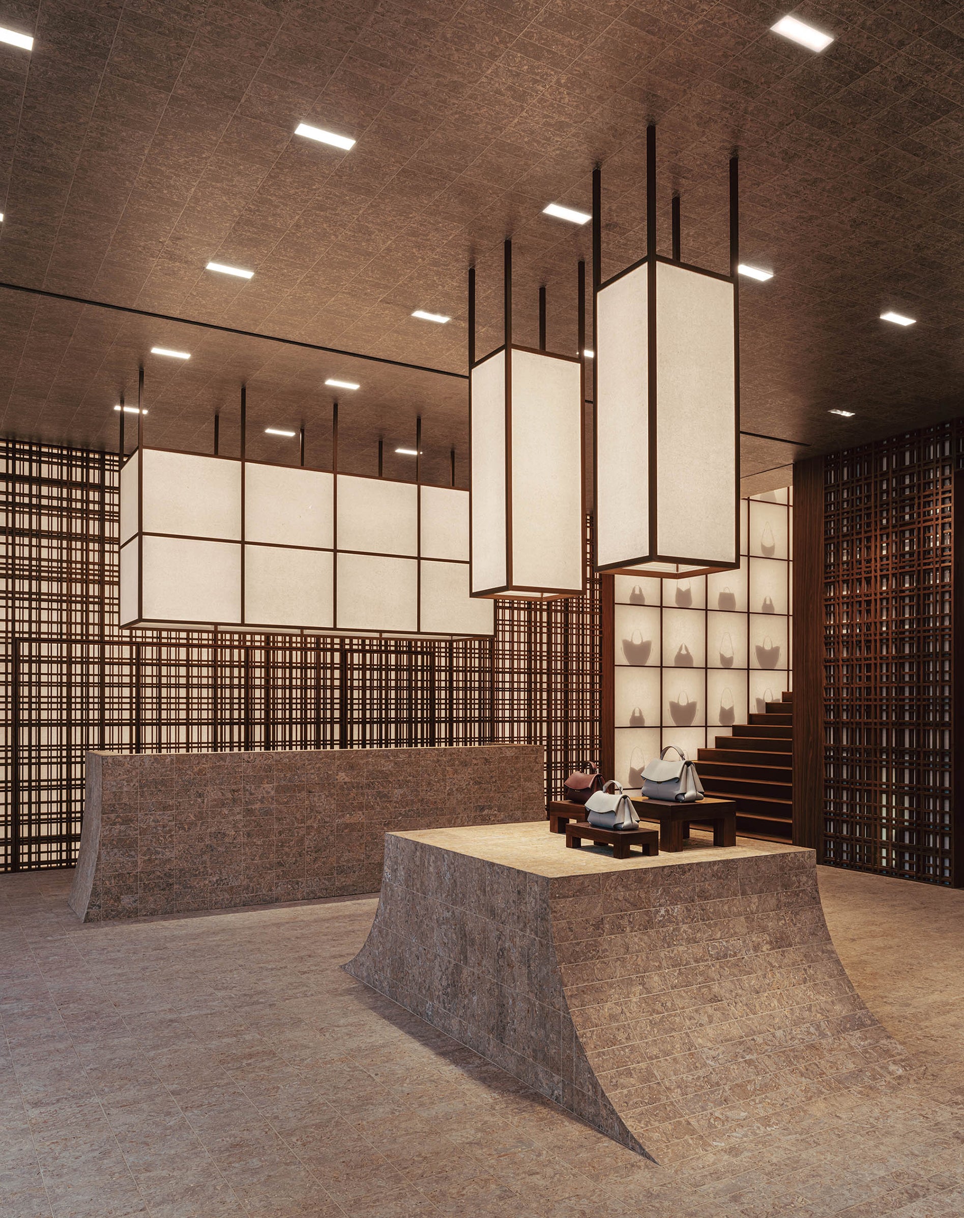 Quadrillant l’espace, le bois de noyer cohabite avec le cuir et le papier Xuan. Douze tonnes de chutes de cuir ont été upcyclées pour créer des briques en cuir compressé. Ce matériau innovant laisse une empreinte presque minérale dans la boutique. L’utilisation du papier Xuan fait rayonner le patrimoine culturel chinois. Créé à partir d’écorce de santal bleu et de paille de riz, le papier Xuan naît selon un processus manuel précis, transmis oralement entre les générations d’artisans.