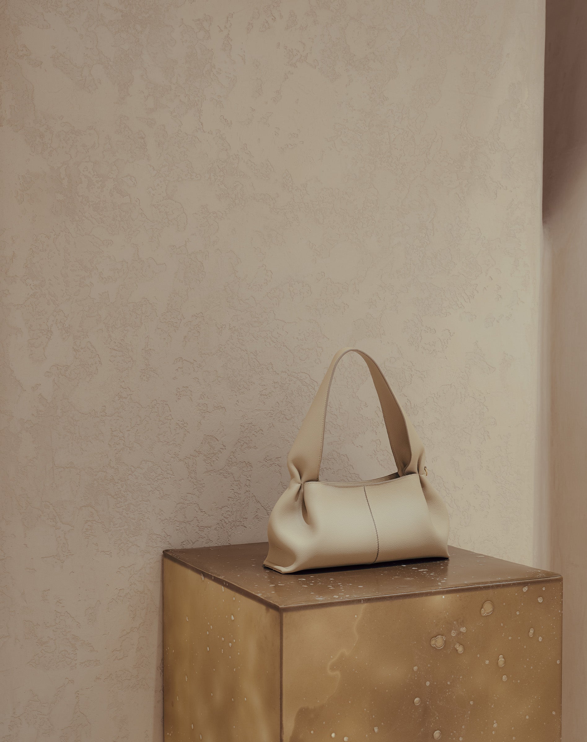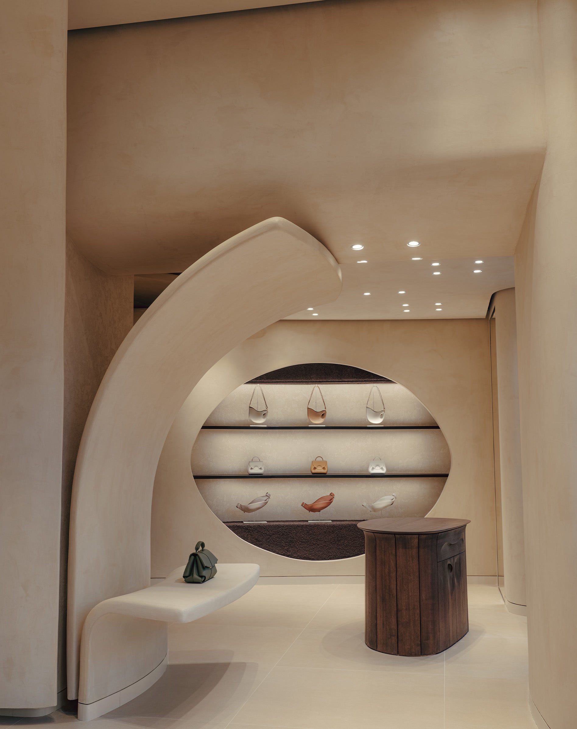 La maison collabore avec des artisans locaux pour créer un univers singulier : l’architecte et sculpteur Nicholas Shurey signe deux tables en noyer aux formes généreuses et organiques, et le laboratoire de design Natural Material Studio conçoit six stèles rétroéclairées qui illuminent d’un halo doux les sacs présentés en vitrine.