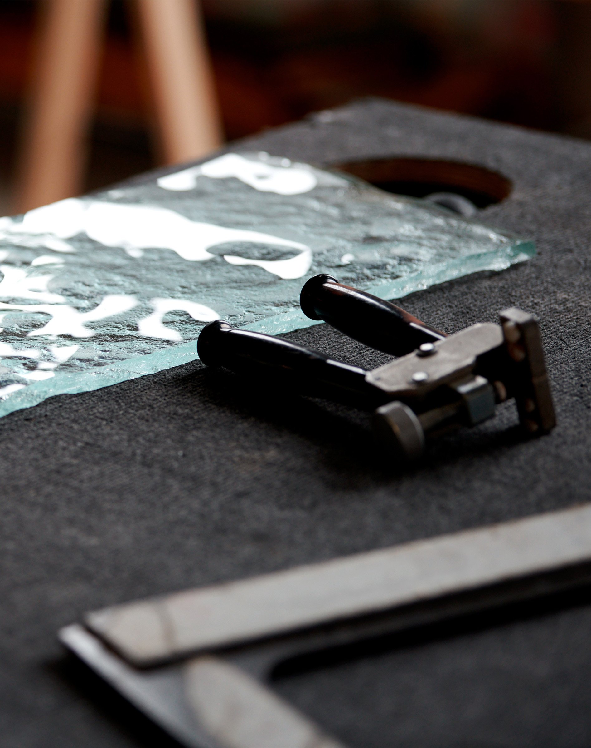 Avec ses panneaux de verre conçus par les verriers de l’Atelier Barrois, l’escalier illustre l’écoulement de l’eau. Les artisans ont également réalisé une table de verre sur-mesure à l’allure glacée, co-signée par le designer Johan Viladrich.