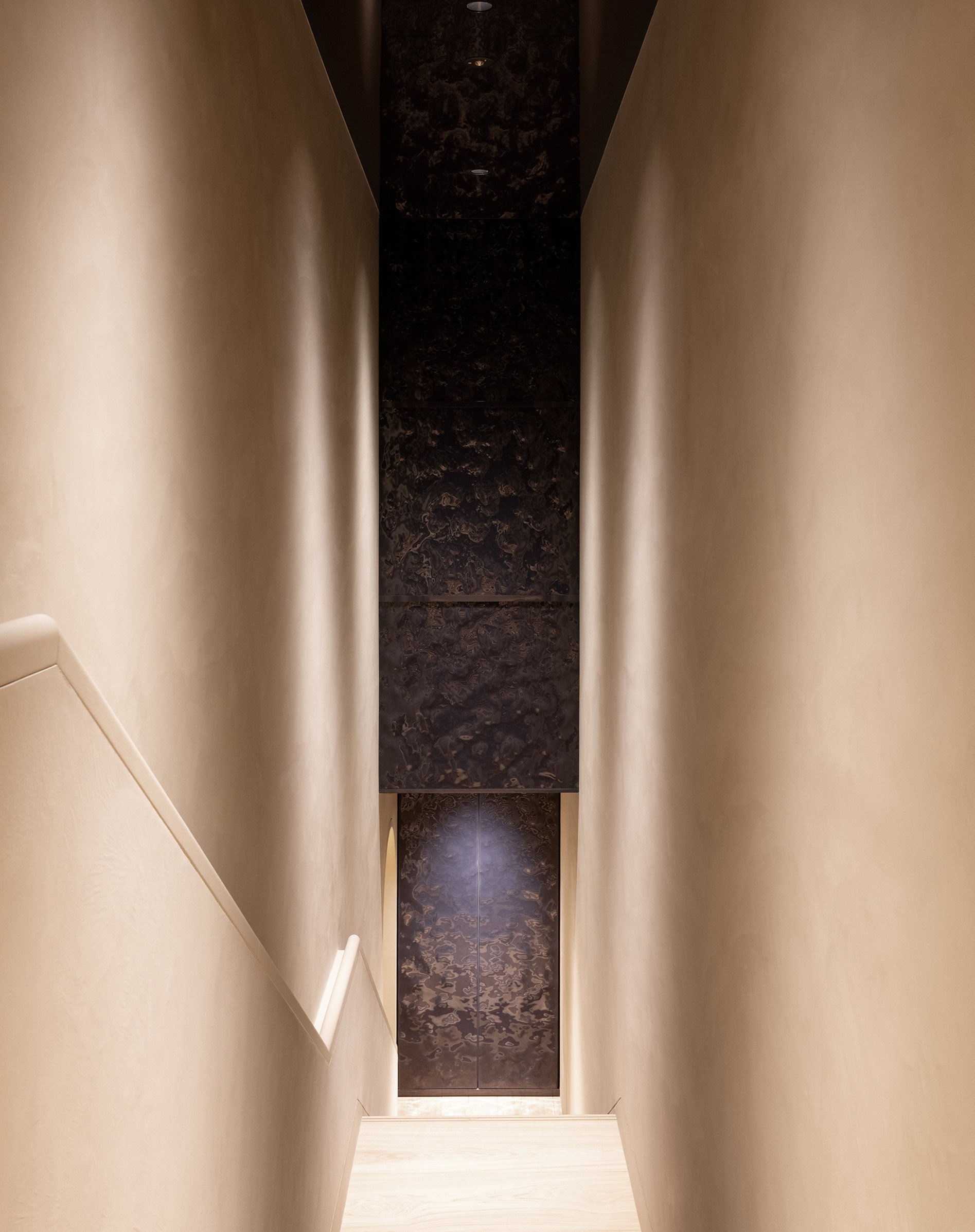 Sol créé avec du chêne japonais, lampes en cuir imitant des galets polis par la houle, murs aux teintes naturelles, les liens avec le monde extérieur inspirent cet intérieur.