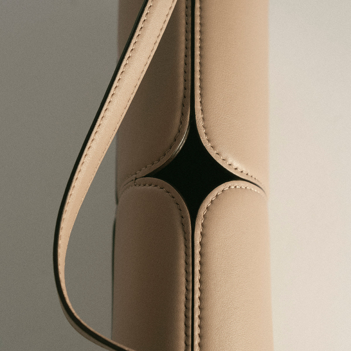 Le design du modèle Osmo repose sur une construction de modules en cuir qui se répètent, se répondent et s’imbriquent pour créer un ensemble symétrique.