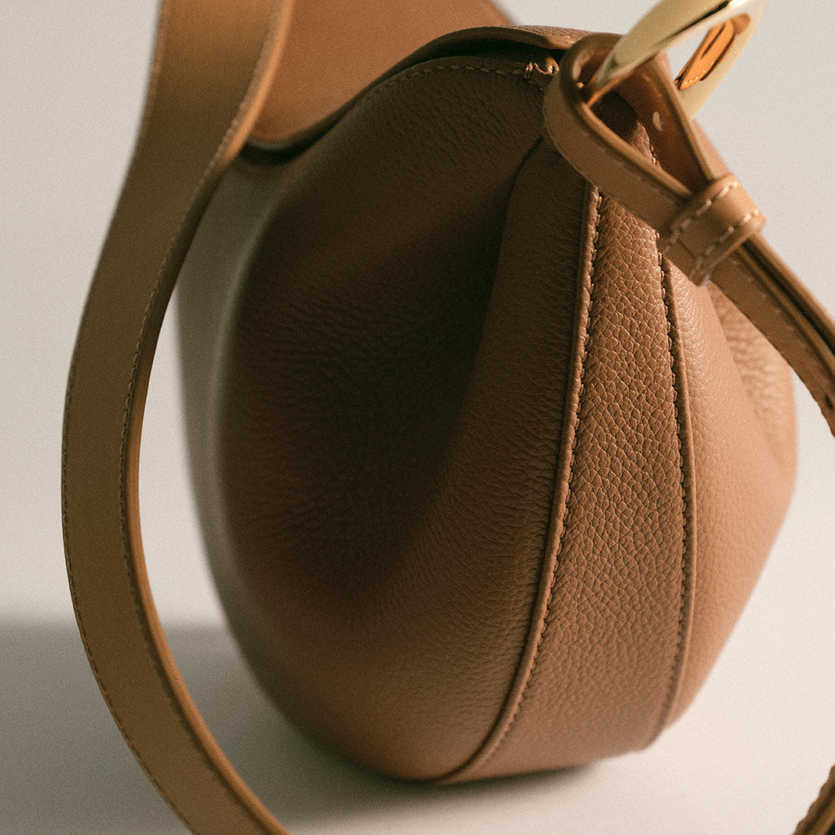 Obtenue par le modelage du cuir sur moule en bois, la forme ronde de la besace "Tonca" est galbée par les plis dont le mouvement se prolonge dans la boucle métallique torsadée. Corps du sac et bandoulière contrastent par un jeu de cuirs lisse et grainé.